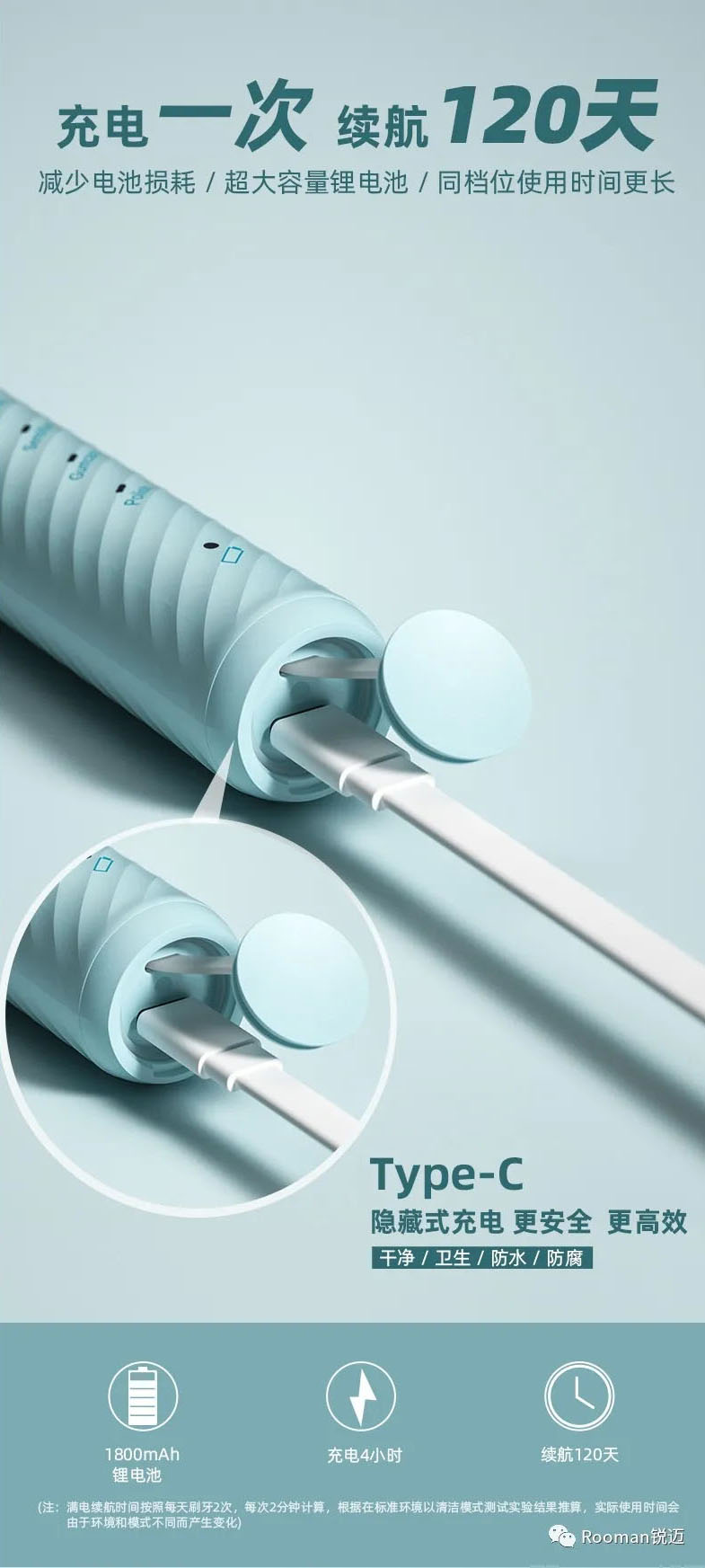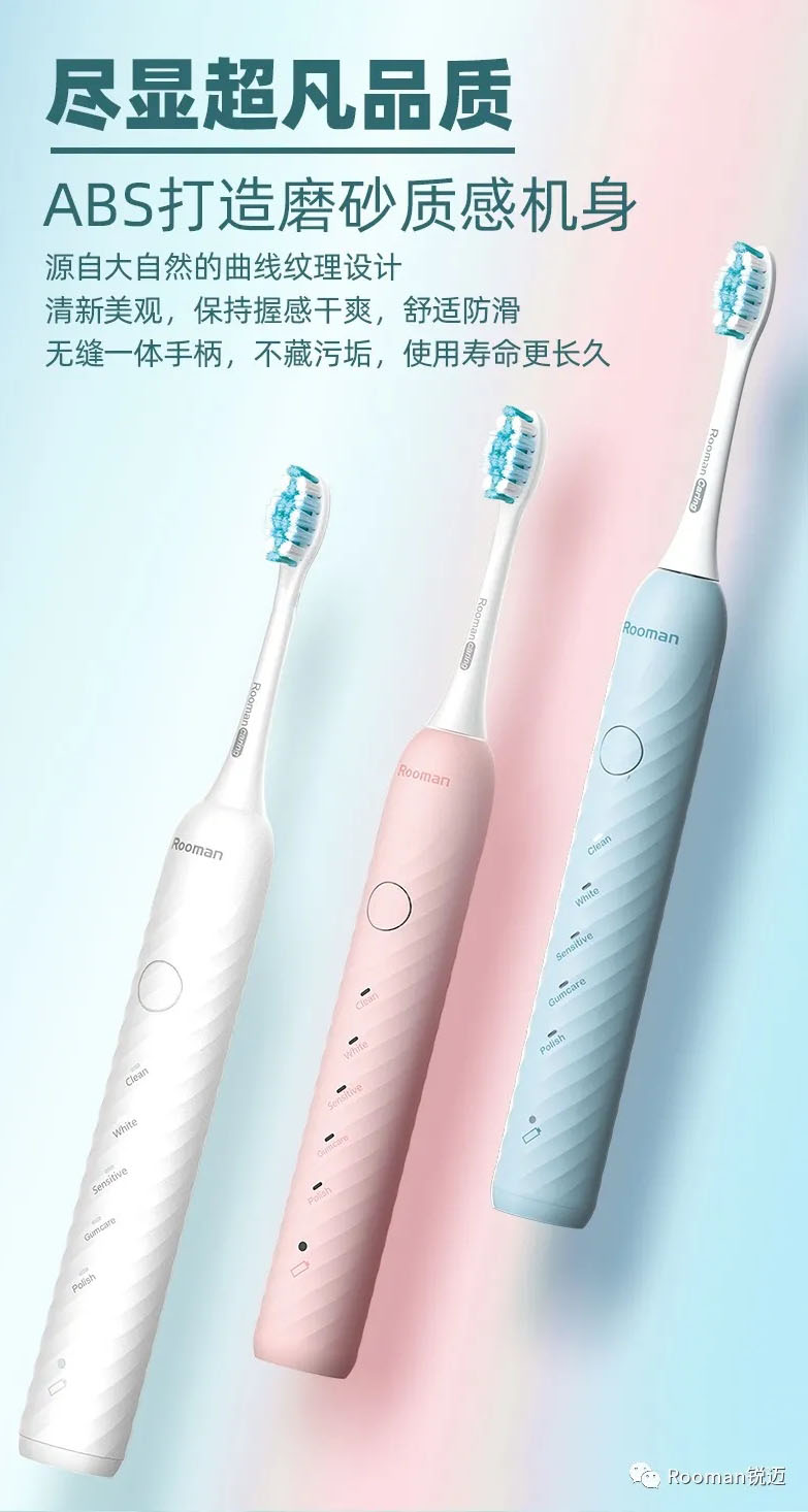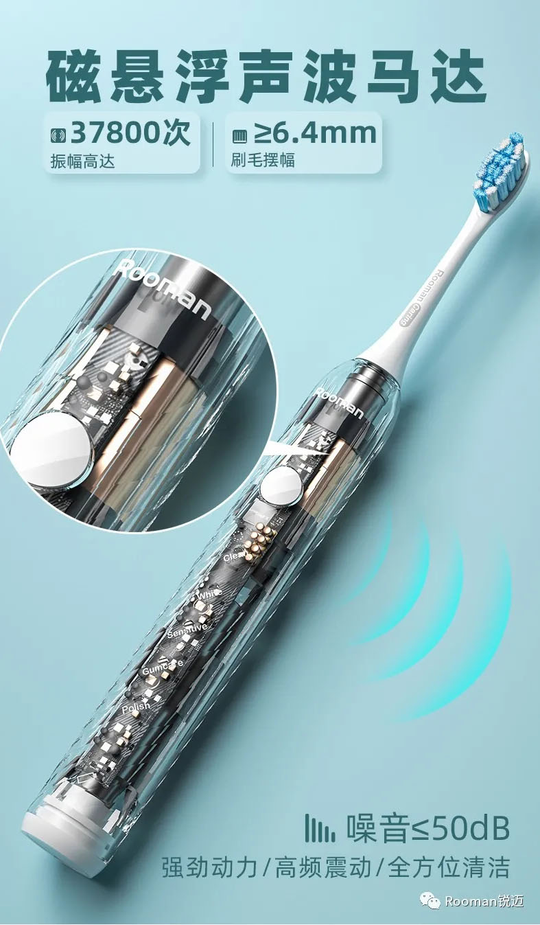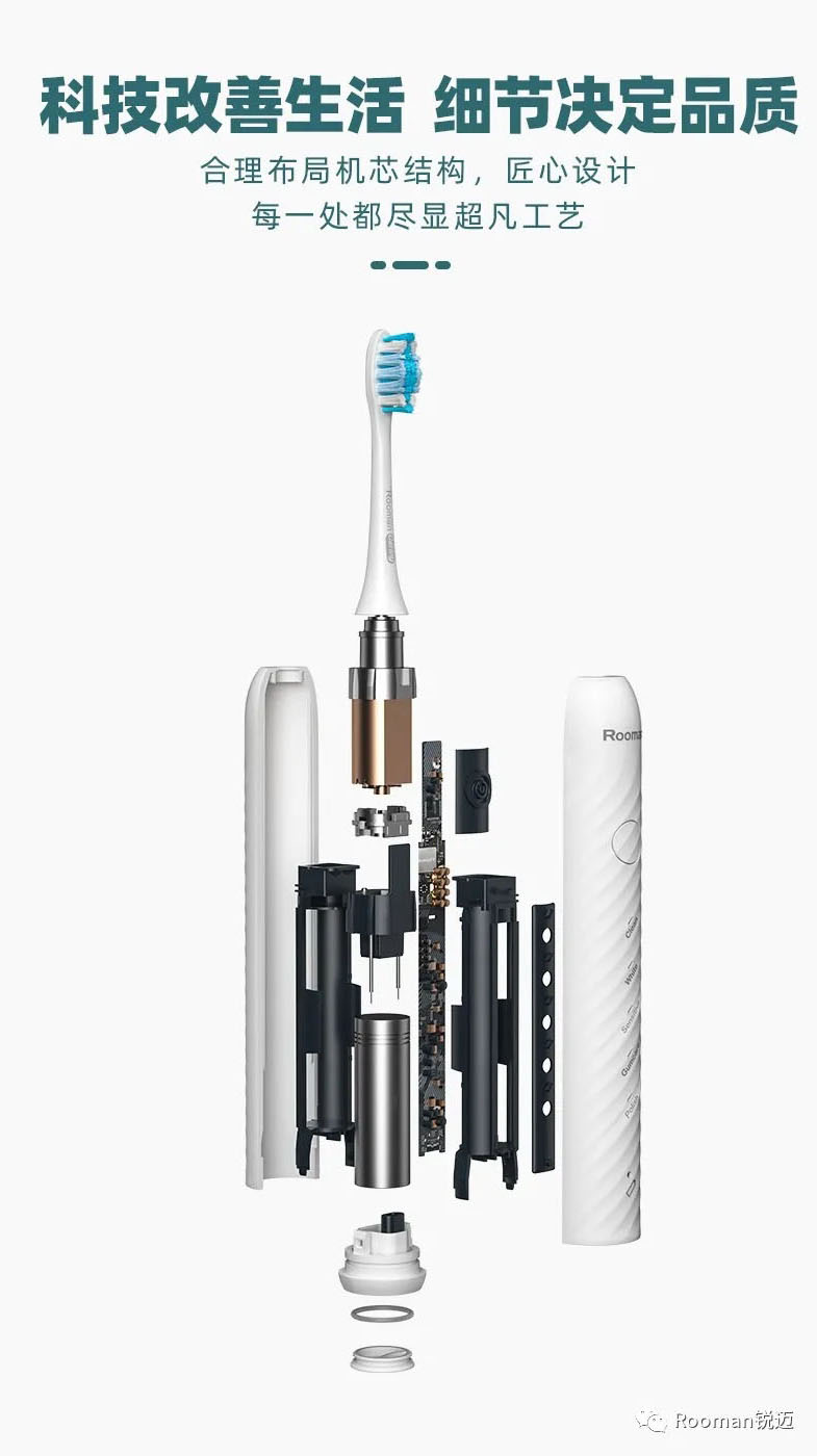 Rooman | 銳邁K5對整機做了降噪處理,從每一個元器件上都層層把關,選擇高品質的原材料,匠心工藝,科學布局機芯結構。每一處小細節(jié)的改善都在提高電動牙刷的整體性能和降噪效果。